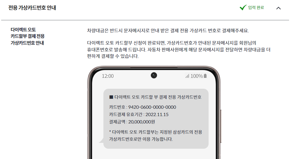 다이렉트오토 카드할부 가상카드번호가 신청자의 휴대폰 문자로 옵니다. 추후 테슬라 코리아 ARS 결제할 때, 이 '가상카드번호'를 입력합니다. (가상카드번호 입력 후 비밀번호는 신청자의 실물 삼성카드 비밀번호 앞 2자리 입력)
