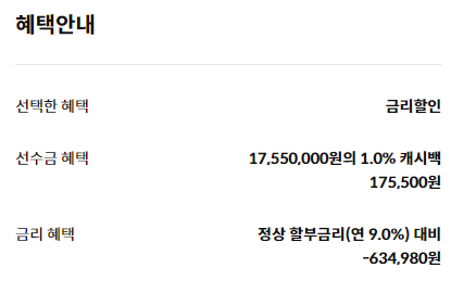 선수금 17,550,000원을 입력하면, 캐시백 1.0% 인 175,500원을 받을 수 있습니다.