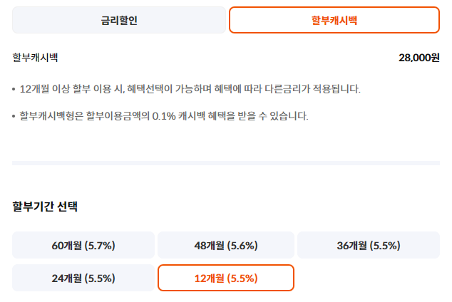 금리할인을 하면 할인된 금리를 적용받을 수 있고 (4.9% ~ 5.0%), 할부캐시백은 할부이용금액의 0.1% 캐시백을 받을 수 있습니다. 보통은 '금리할인'을 선택하시는게 혜택이 더 큽니다.