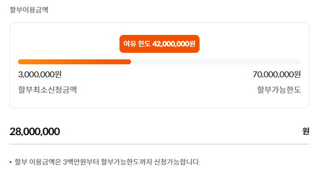 저는 할부금액 28,000,000원을 입력하였습니다. 최대 70,000,000원까지 할부한도가 가능합니다