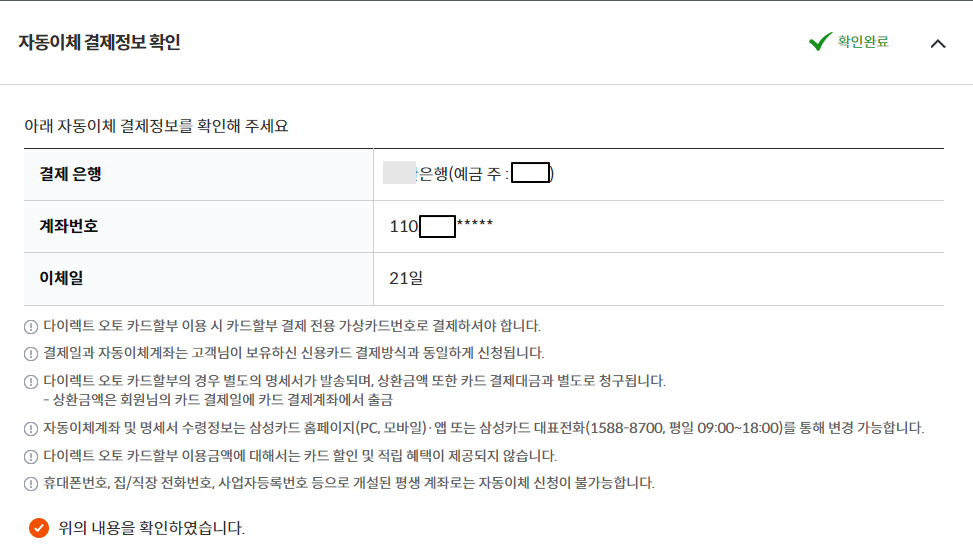 자동이체 결제정보를 확인하고 '다음'으로 넘어갑니다