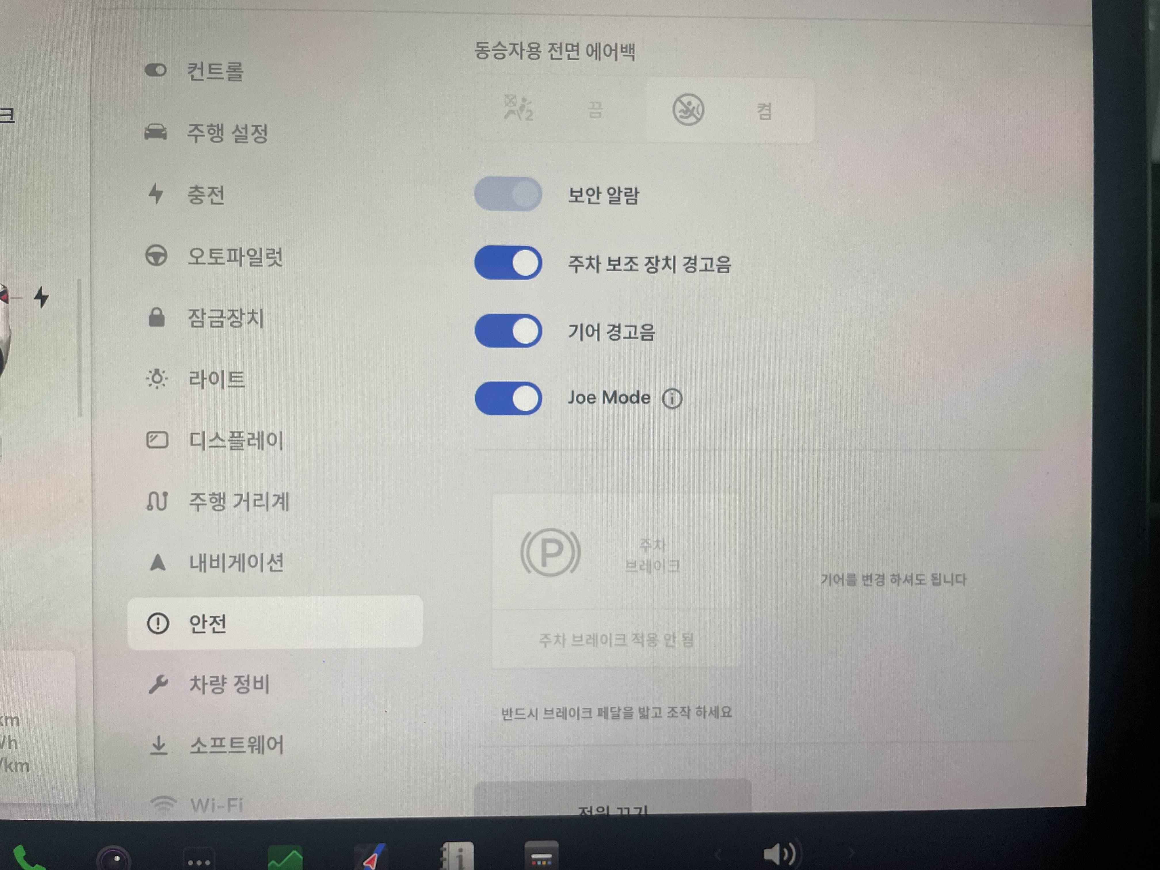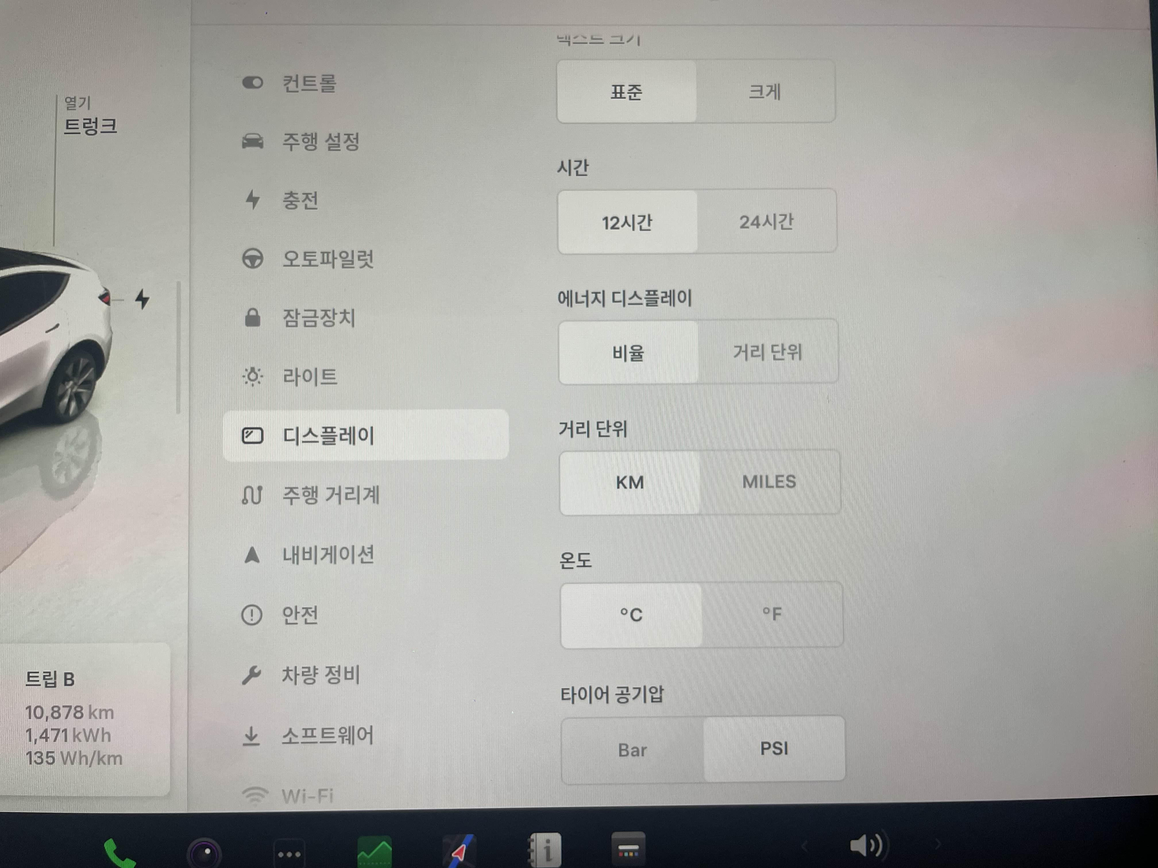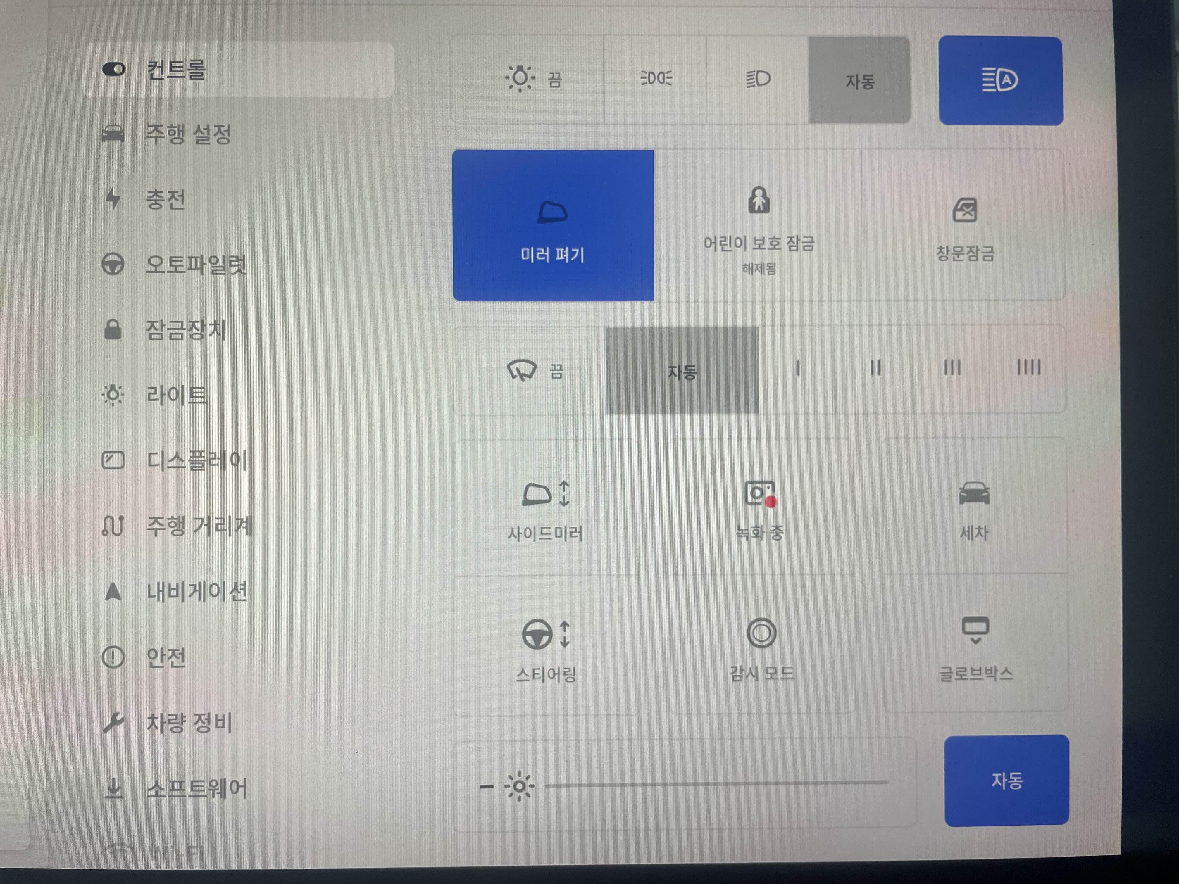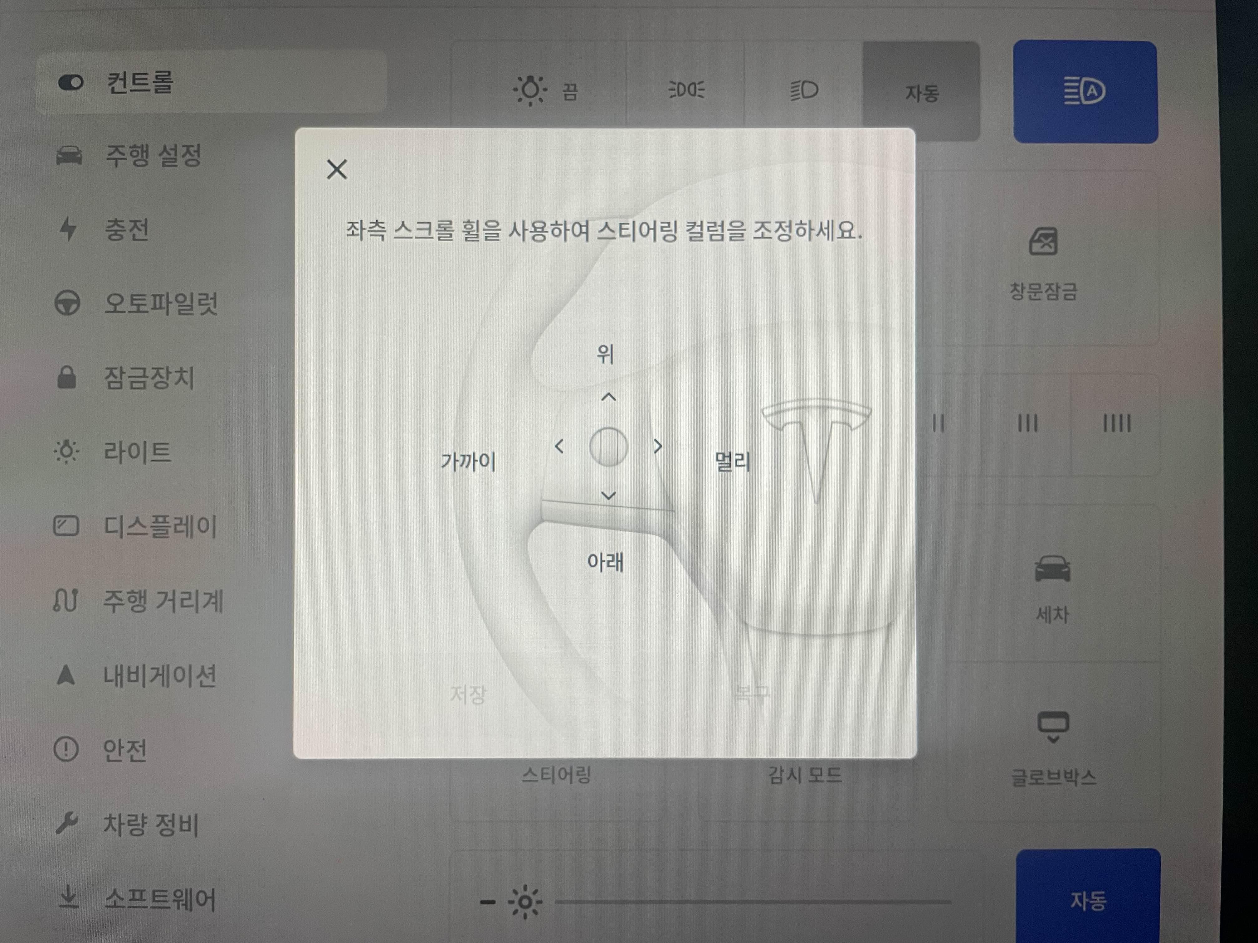 셋팅방법은 테슬라 모니터 좌측 하단 '자동차' 모양의 아이콘을 누르면 설정화면이 뜹니다.