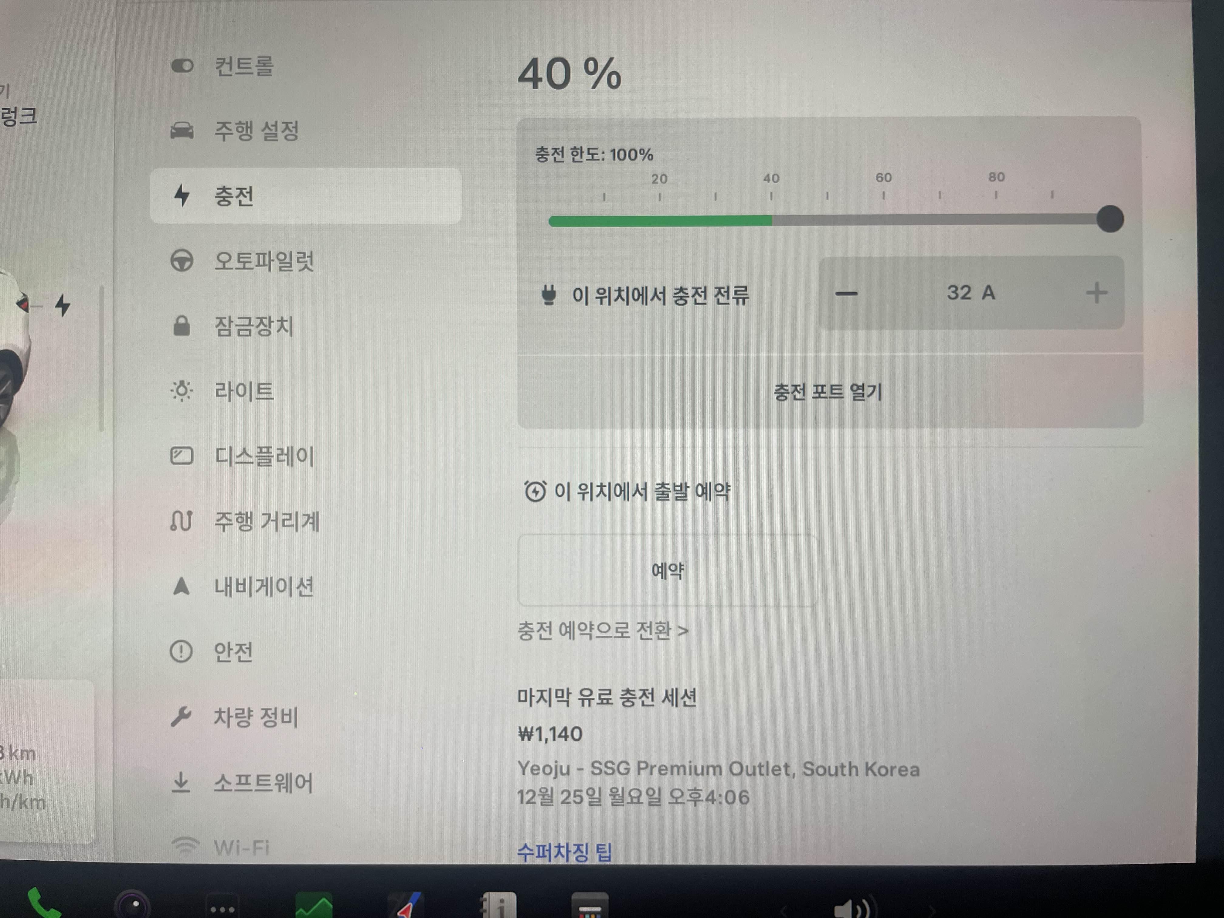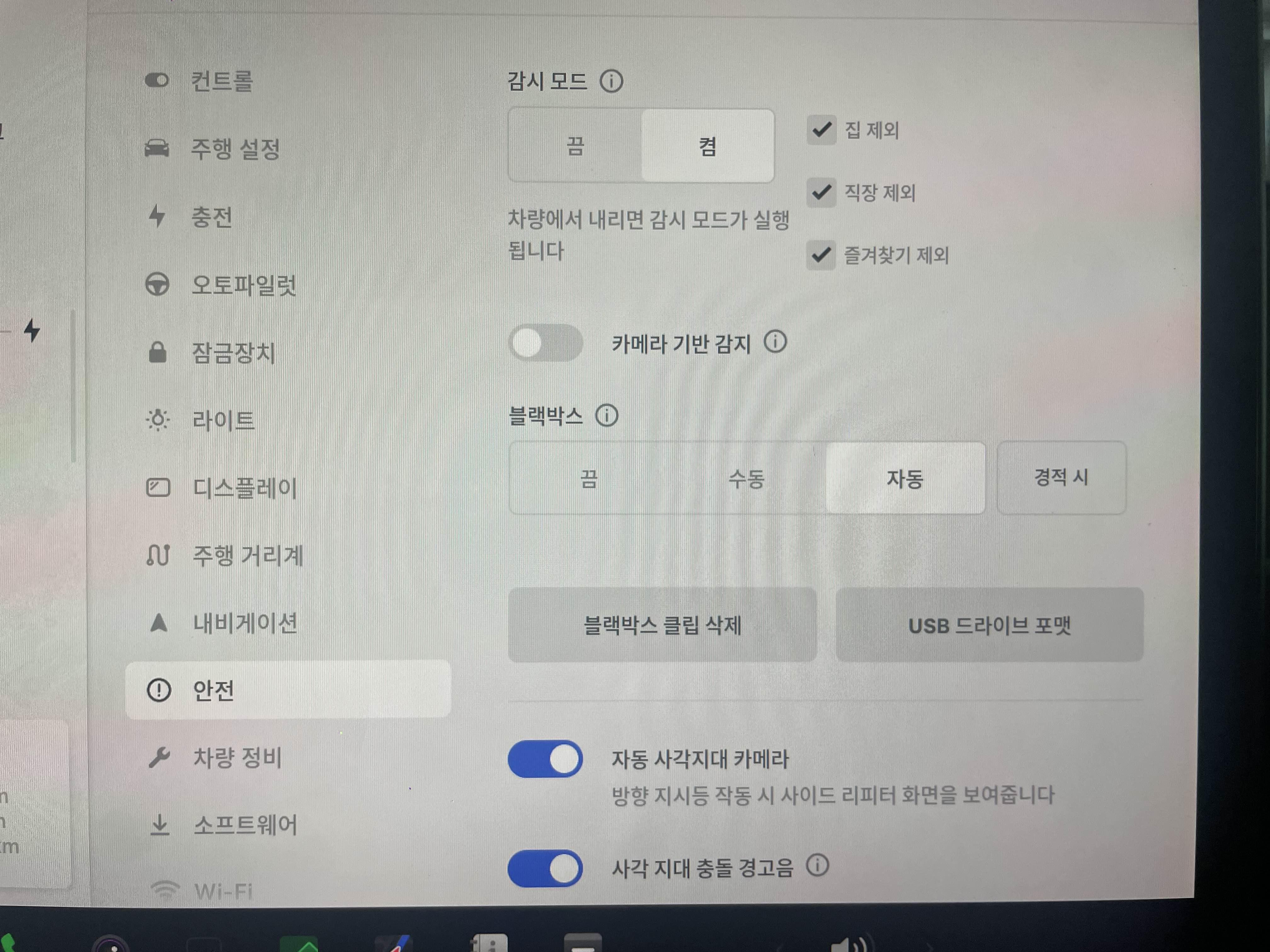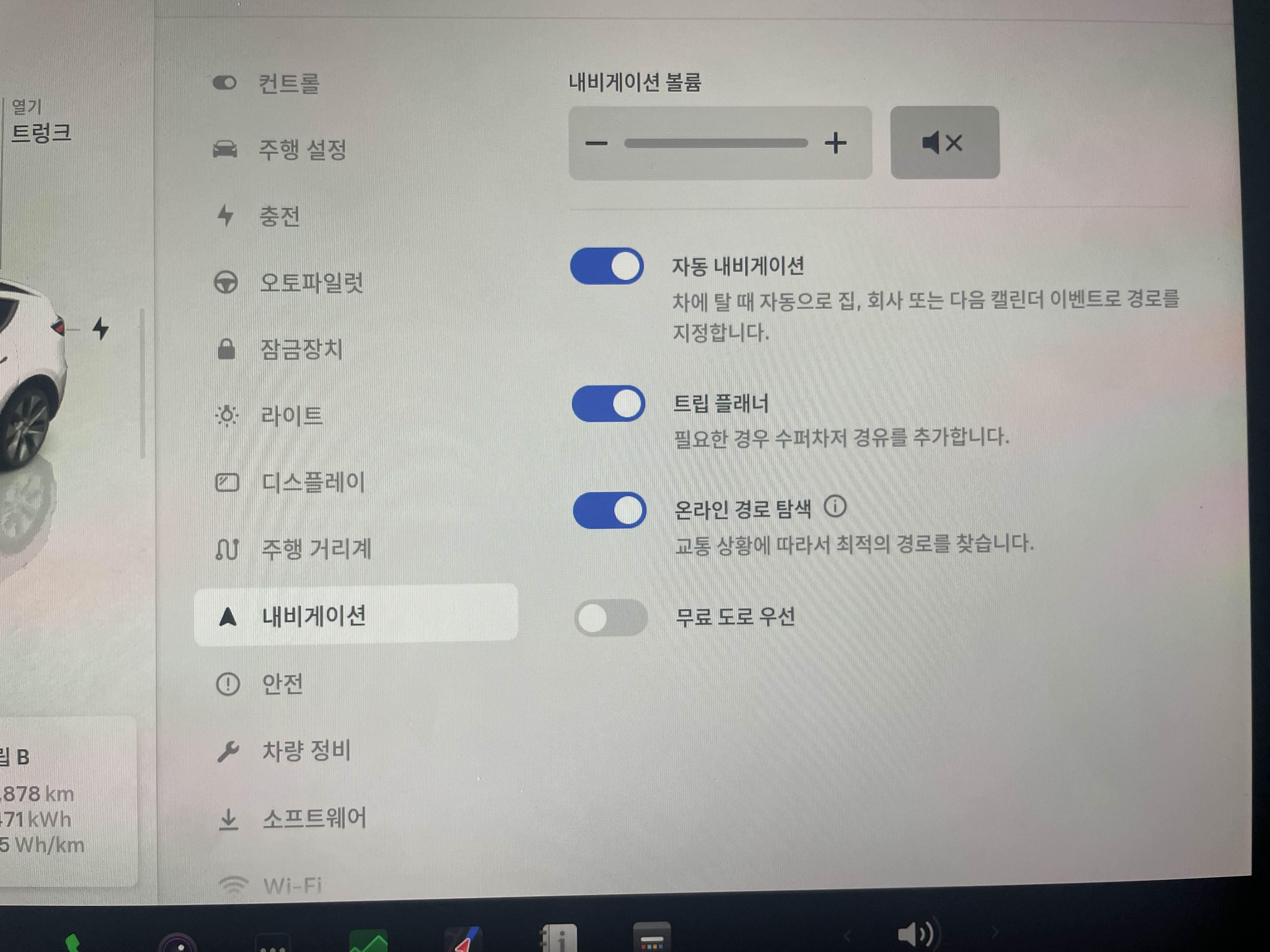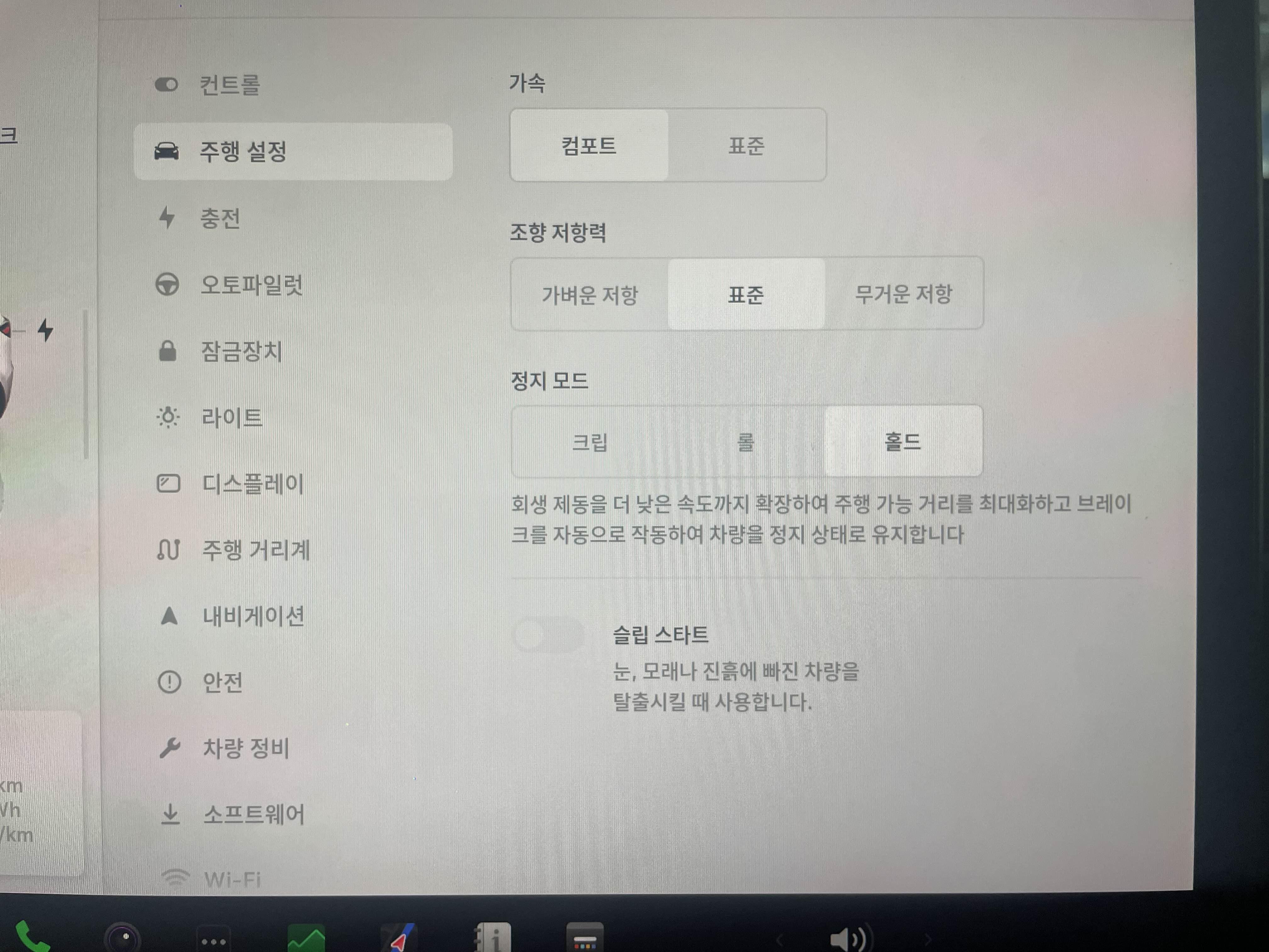 셋팅방법은 테슬라 모니터 좌측 하단 '자동차' 모양의 아이콘을 누르면 설정화면이 뜹니다.
