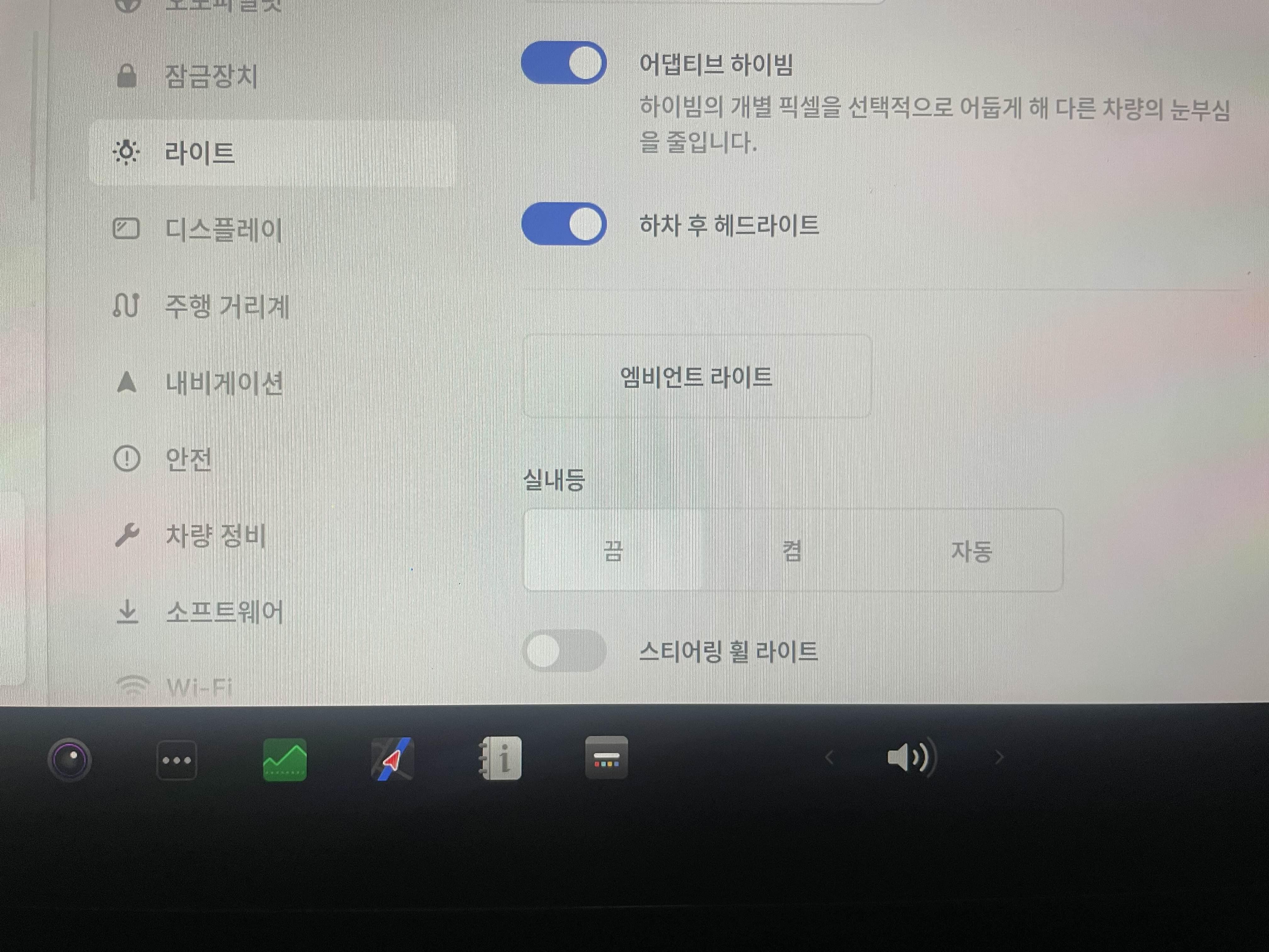 실내등은 끔 또는 자동으로 설정해 줍니다. 차량 문이 열릴 때 실내등이 켜질지 여부를 설정하는 것입니다.