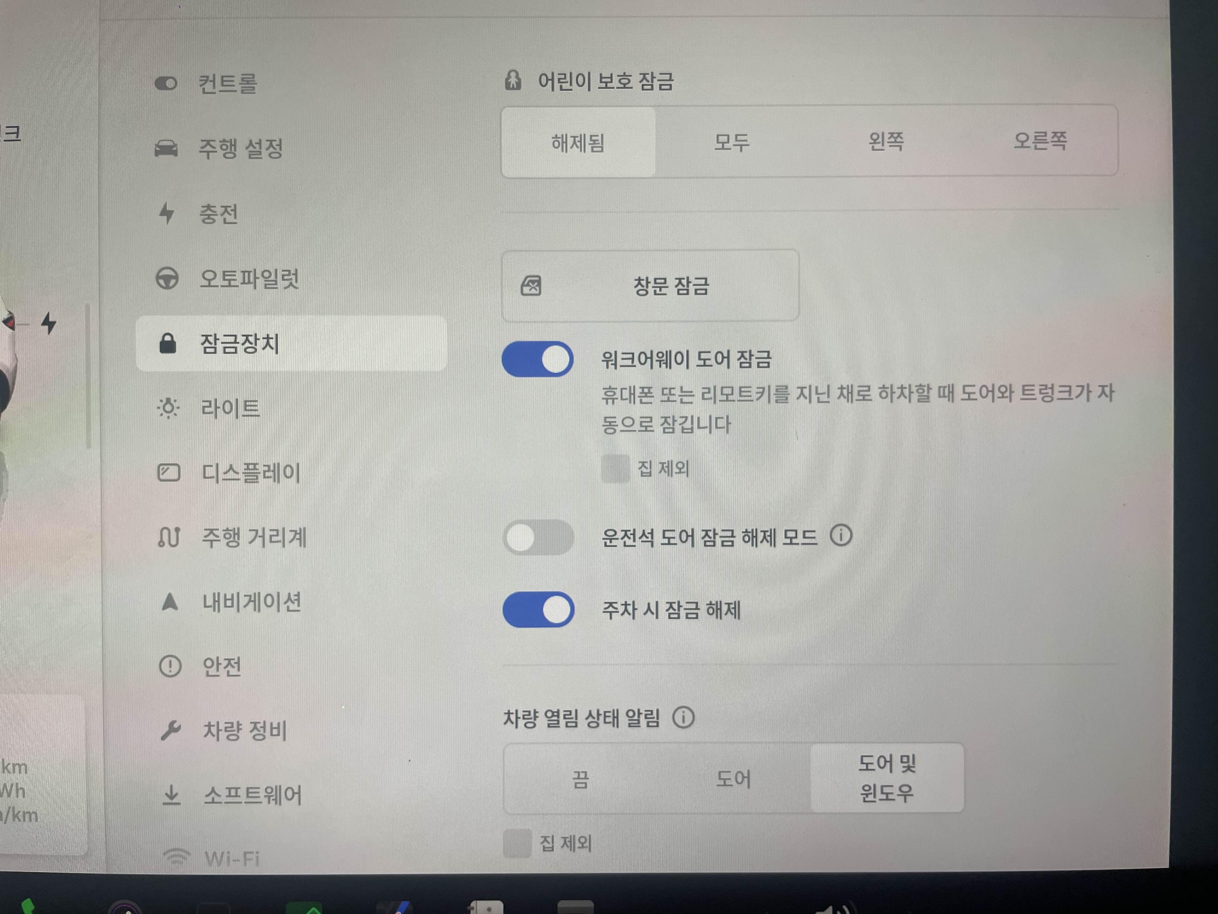 '운전석 도어 잠금 해제 모드'는 꺼줍니다. 이걸 켜게 되면, 테슬라 운행하려고 잠금 해제 시, '운전석'만 열립니다. 가족들과 같이 타는 차에서는 필요없는 기능입니다.