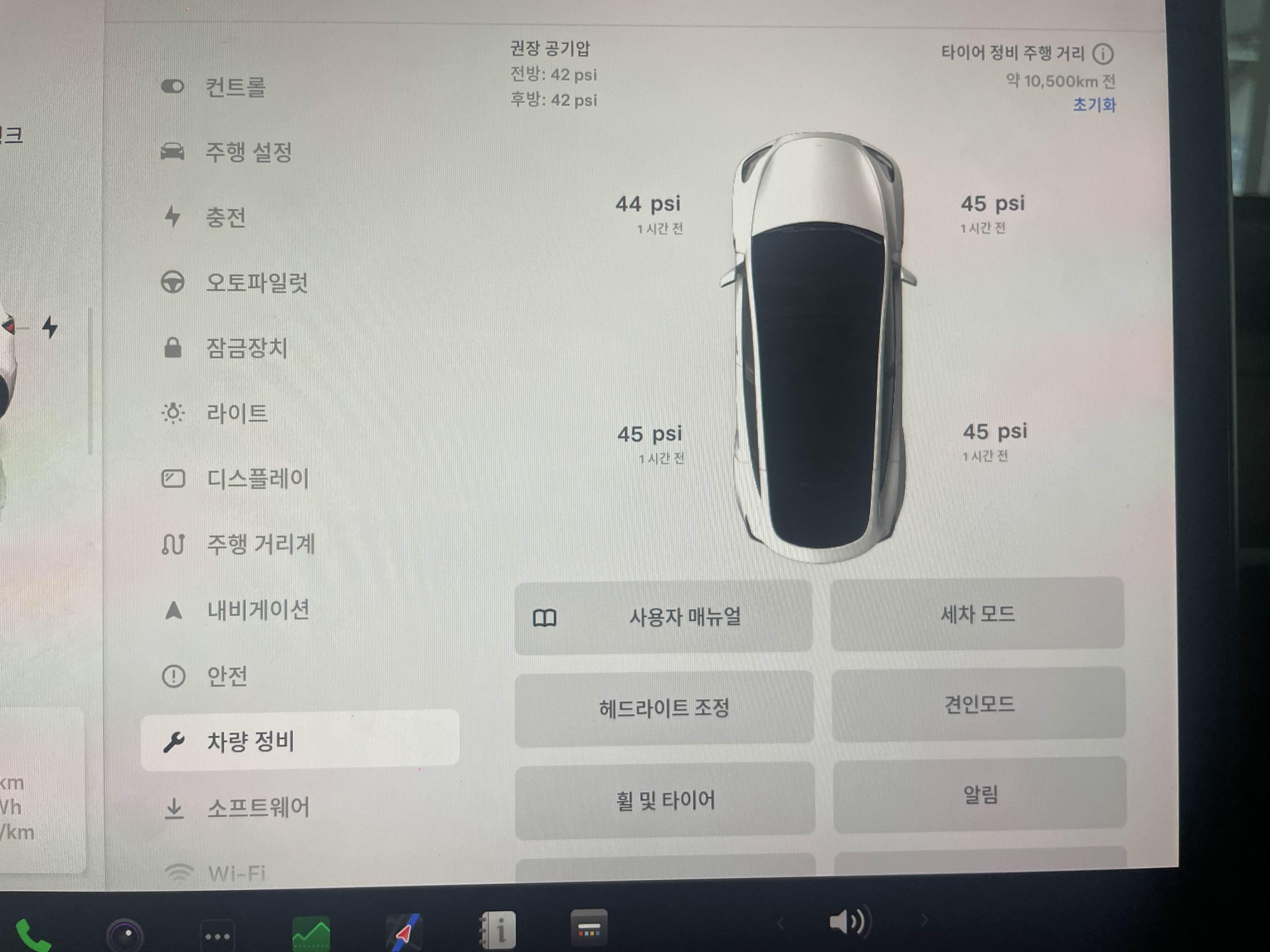 차량 정비모드에서 타이어 공기압을 확인할 수 있습니다. (권장 공기압은 42psi 입니다)