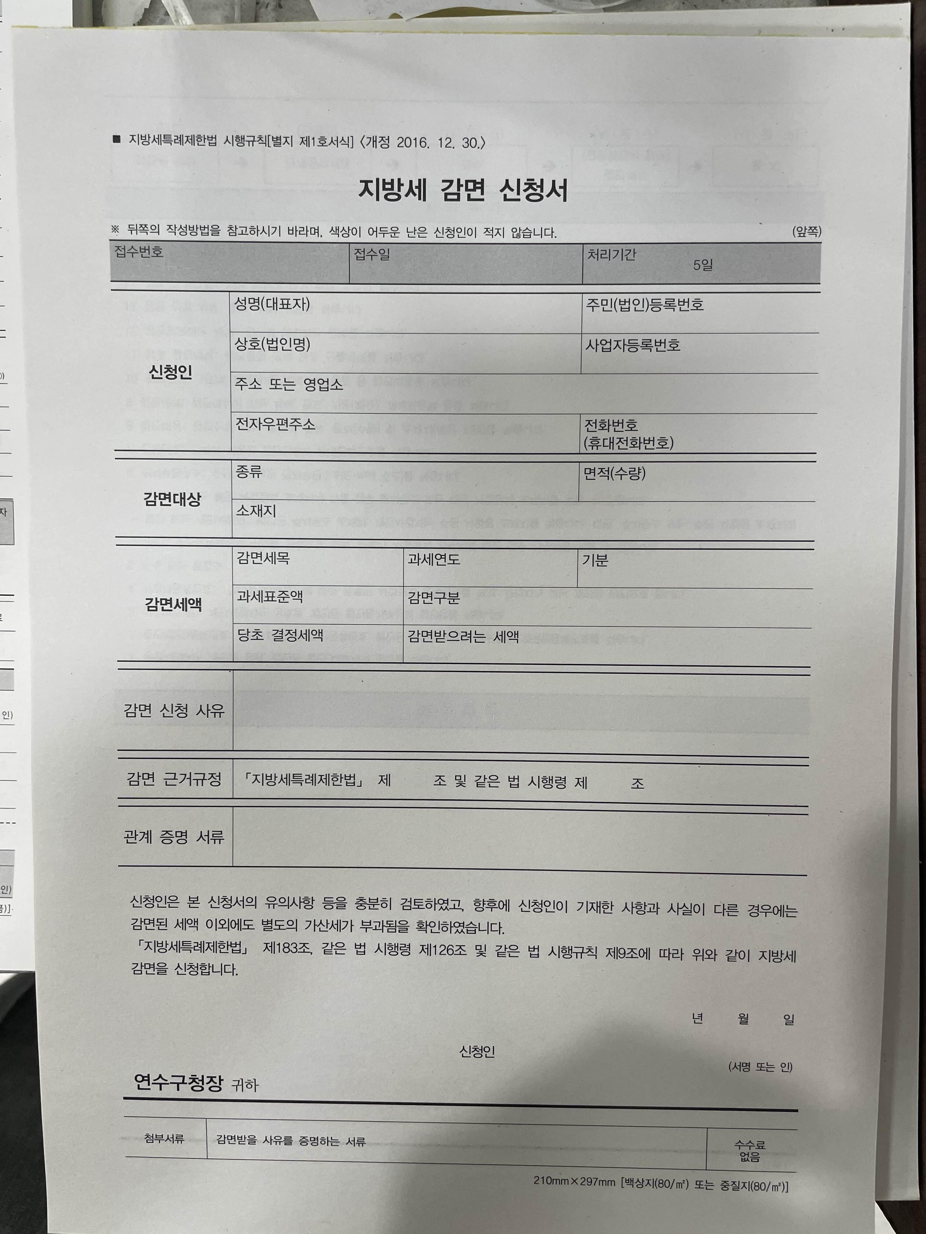취득세 창구에 와서는 위에서 작성한 서류 2개 (취득세 신고서, 지방세 감면 신청서)를 제출하시면 됩니다. 그럼 구청직원분께서 취득세 '고지서'(노랑색 종이)를 주십니다.