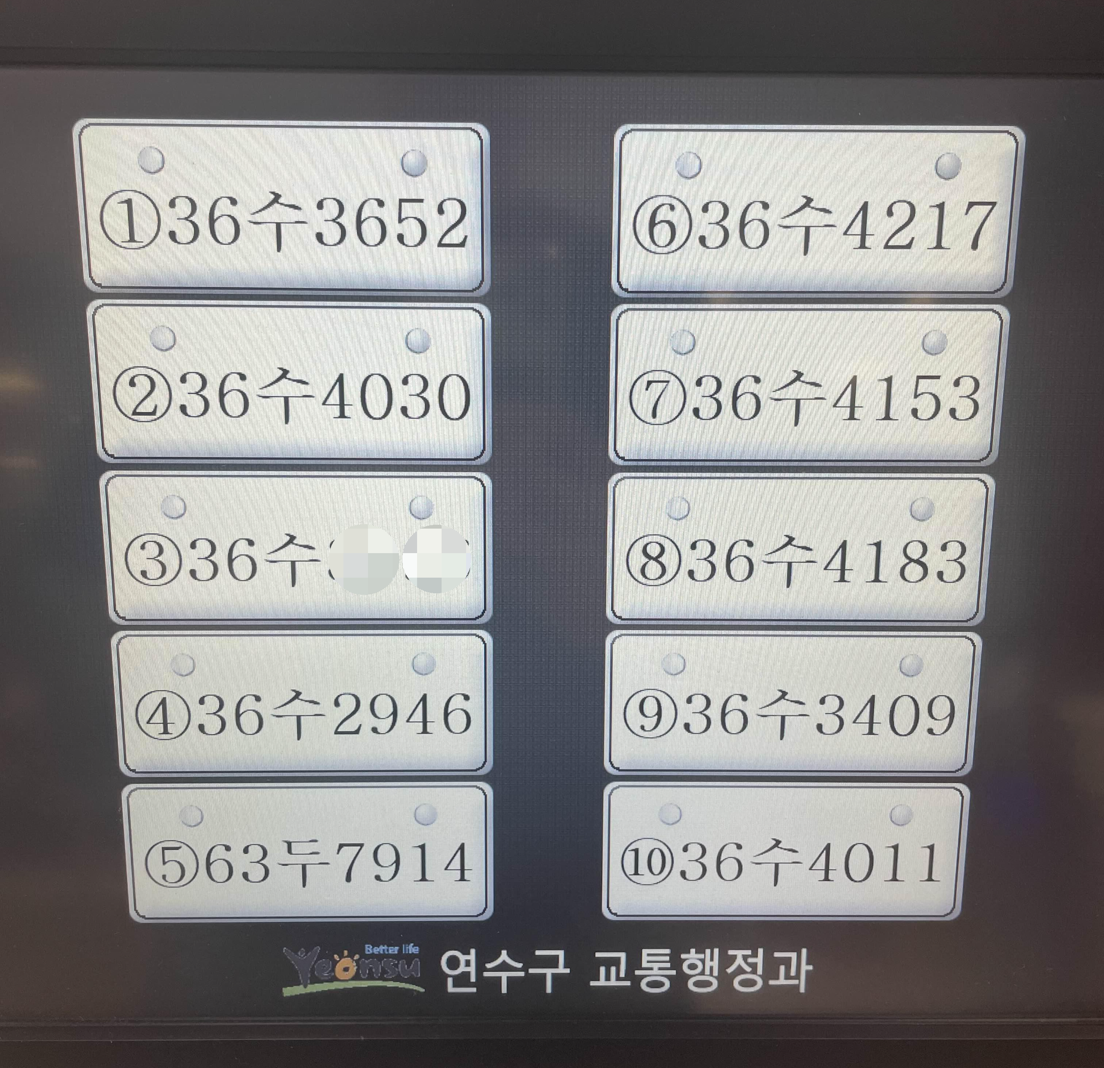 그럼 구청 직원분께서 처리를 해주시고, 차량번호 10개를 화면에 띄워 주십니다. 이 중에서 마음에 드는 번호를 고르시면 됩니다. 번호는 한번만 띄워주십니다. 만약 마음에 드는 번호가 없다면, 다른 구청으로 가서 다시 차량등록 신청하시면 됩니다.