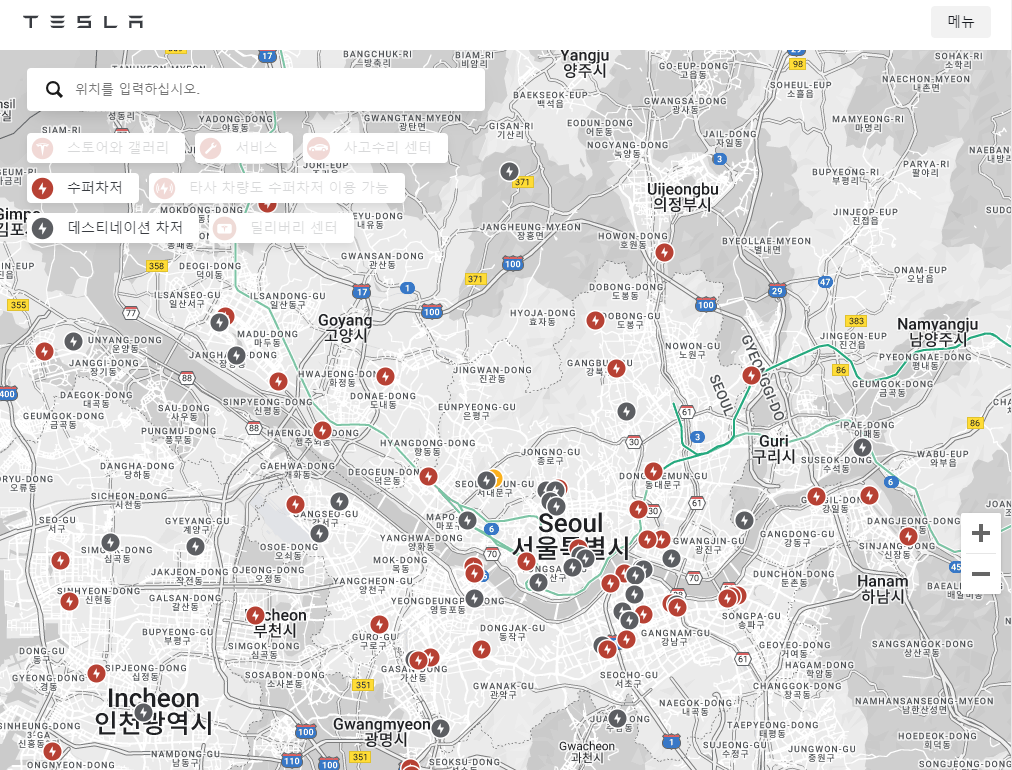 테슬라 수퍼차저 검색을 통해서 지도에서 수퍼차저를 찾아보세요.
