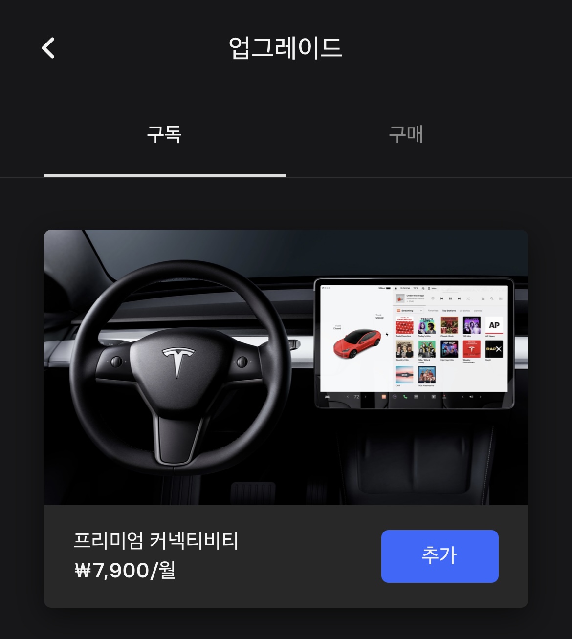 또는 테슬라 어플에서 '업그레이드'로 들어가서 '프리미엄 커넥티비티'를 신청할 수 있습니다.