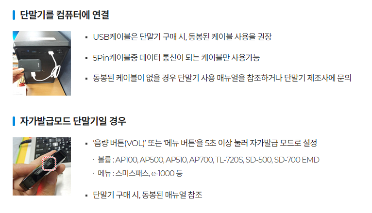 그 후 단말기에 VOL 버튼을 5초 이상 눌러 'USB자가발급 모드'로 설정해줍니다(음성출력)