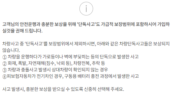 보험이라는 특성상 사람들의 불안한 '심리', '혹시나 하는 마음'을 이용하여 보장범위를 넓히고, 보험료를 높이기 때문에 저는 보험가입은 필요한 최소한의 보장만 가입해도 된다고 생각하여 '단독보상'을 제외하였습니다. 무조건 저와 같이 하지는 마시고 각자의 선택에 따라 진행하시면 됩니다.